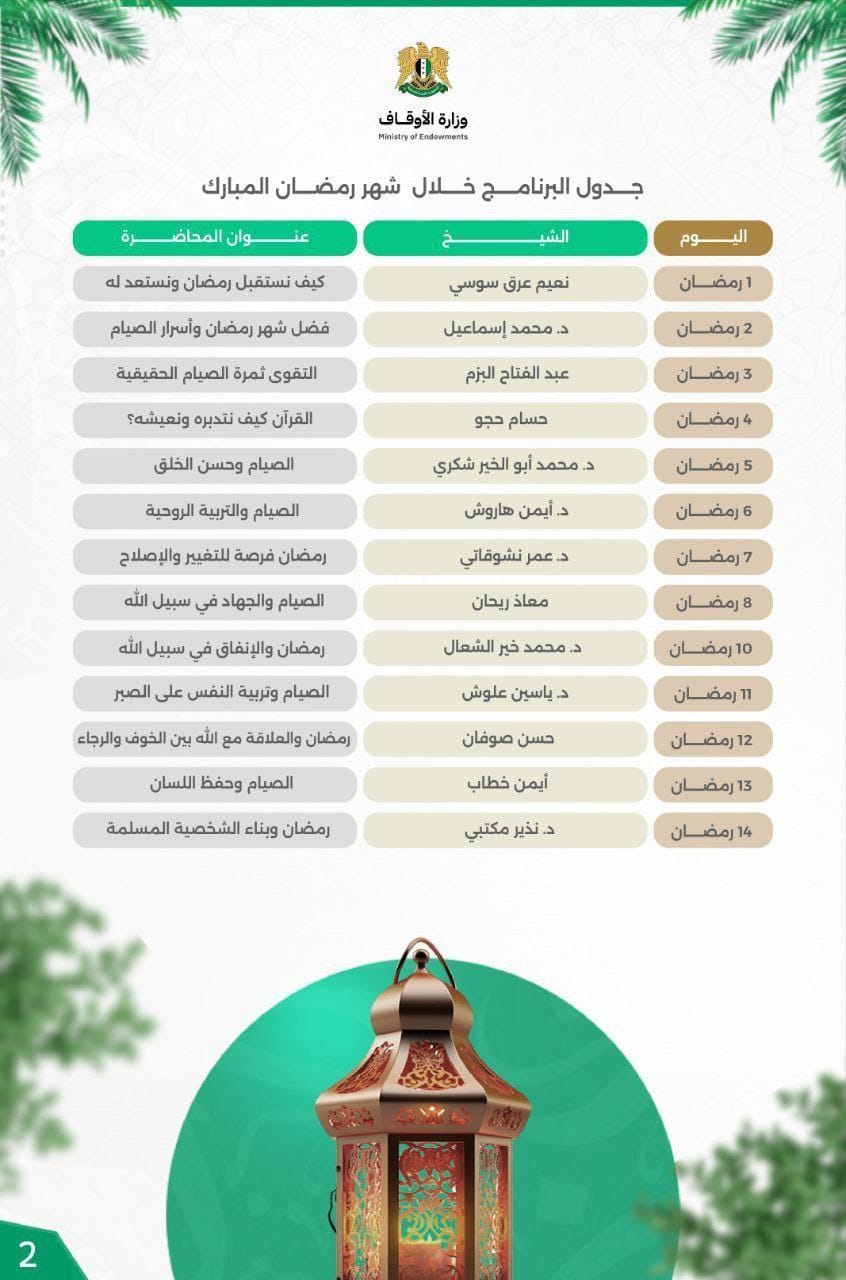 جدول برنامج نفائح رمضان في مسجد بني أمية الكبير بدمشق.