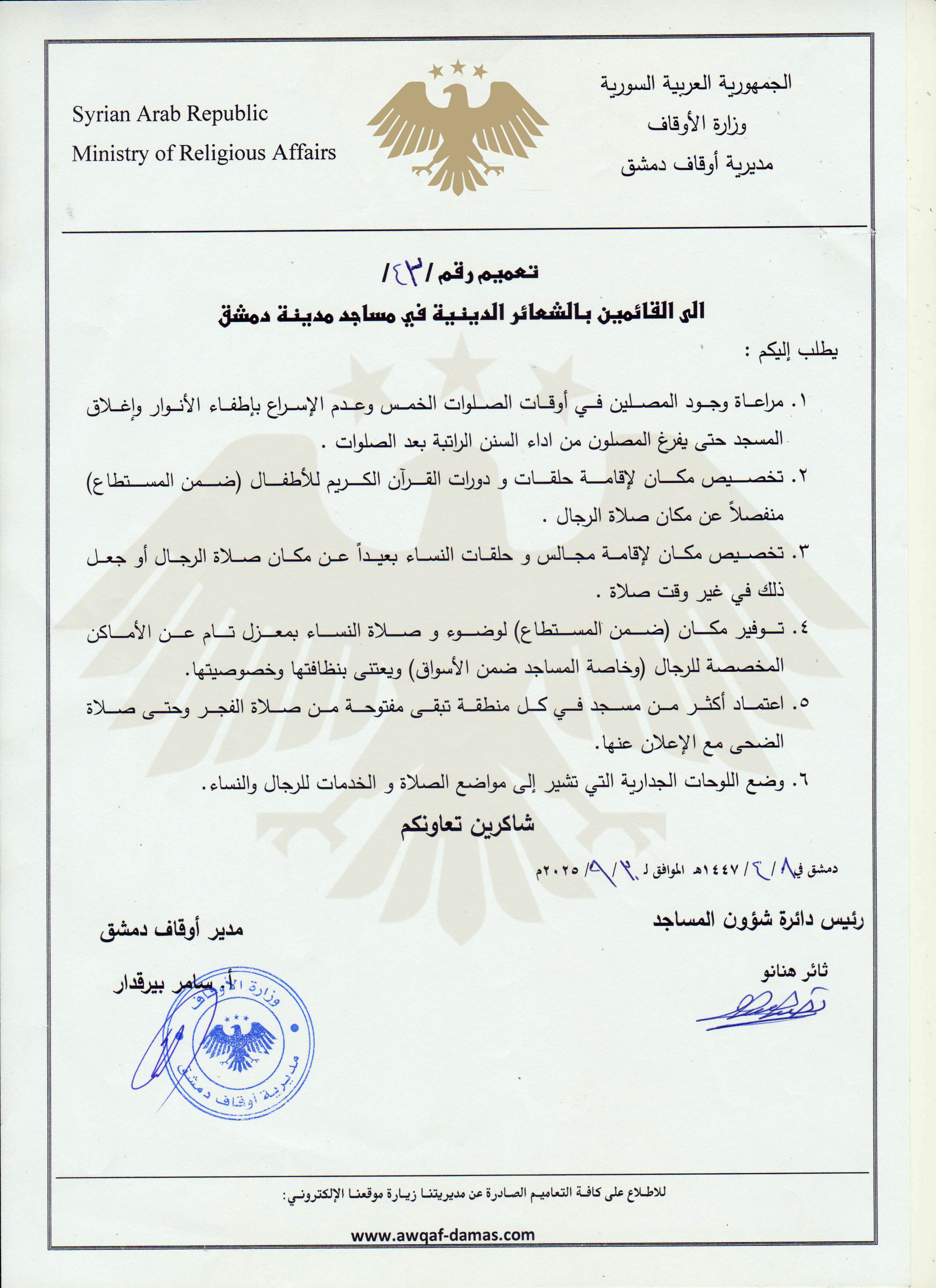 تعميم إلى القائمين على الشعائر الدينية في مساجد دمشق