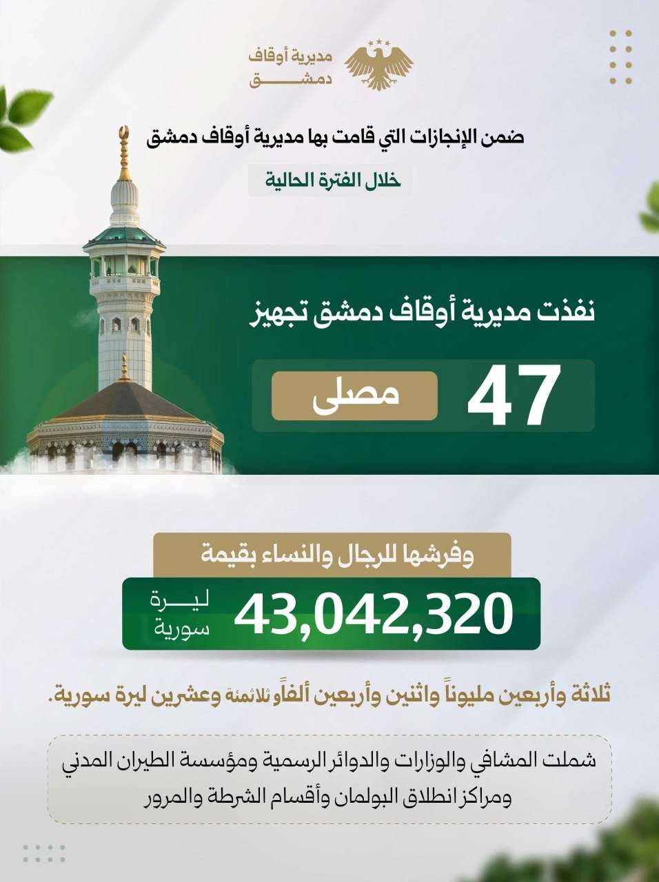 نفذت مديرية أوقاف دمشق تجهيز/ 47/#مصلىوفرشها للرجال والنساء بقيمة 43,042,320 ثلاثة وأربعين مليوناً واثنين وأربعين ألفاً وثلاثمئة وعشرين ليرة سورية. بالإضافة إلى المواد العينية المتبرع بها من أهل الخير من سجاد وإذاعات وغير ذلك. شملت المشافي والوزارات والدوائر الرسمية ومؤسسة الطيران المدني ومراكز انطلاق البولمان وأقسام الشرطة والمرور.