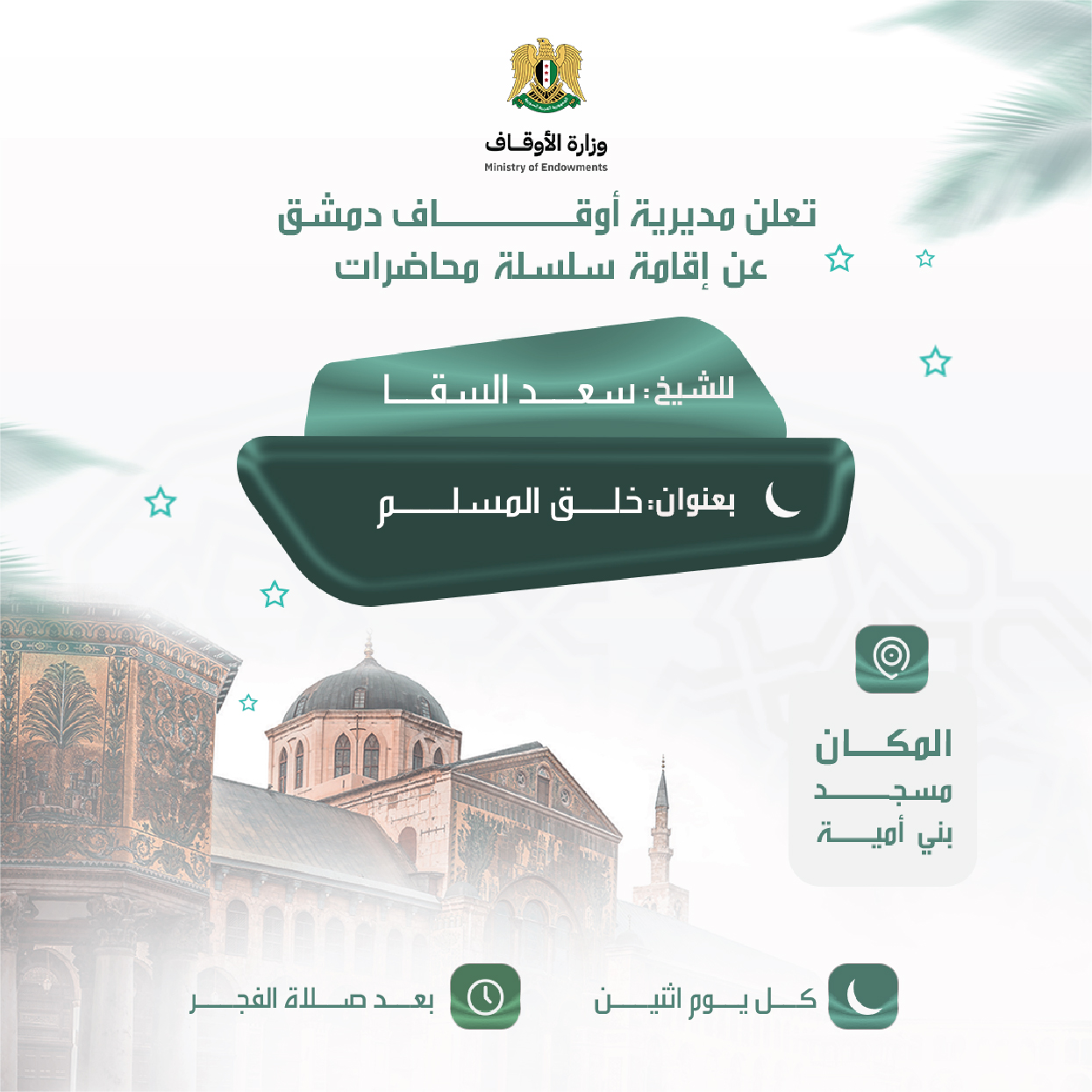 مديرية أوقاف دمشق تعلن عن إقامة سلسلة محاضرات قيّمة يقدمها كوكبة من المشايخ،\rبعد صلاة الفجر والظهر في مسجد بني أمية الكبير بدمشق خلال شهر رمضان المبارك.